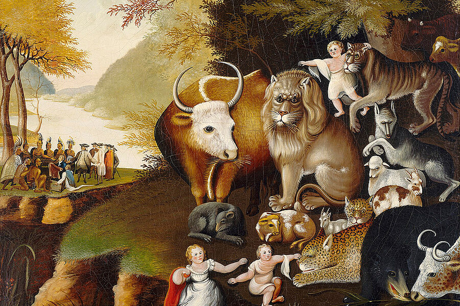 Da wird der Wolf beim Lamm wohnen und der Panther beim Böcklein lagern. Kalb und Löwe werden miteinander grasen, und ein kleiner Knabe wird sie leiten. Kuh und Bärin werden zusammen weiden, ihre Jungen beieinanderliegen, und der Löwe wird Stroh fressen wie das Rind. Und ein Säugling wird spielen am Loch der Otter, und ein kleines Kind wird seine Hand ausstrecken zur Höhle der Natter. Man wird weder Bosheit noch Schaden tun auf meinem ganzen heiligen Berge; denn das Land ist voll Erkenntnis des Herrn, wie Wasser das Meer bedeckt.