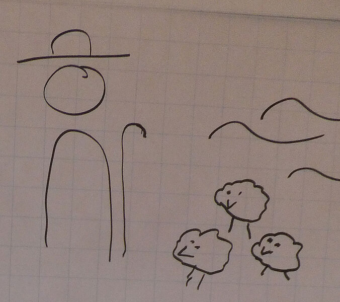 Es war ein Mann, ein Hirte, der hütete die Schafe, hundert Stück. Und er führte sie auf die Weide, damit sie Futter hatten und trinken konnten. Und jeden Abend zählte er seine Schafe. 1,2,3,4.....30.......100. |