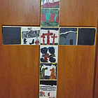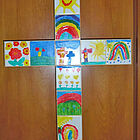Der Vater eines Kindergottesdienstkindes baute ein großes Kreuz, auf das die Fliesen mit den dunklen Farben auf der einen Seite und die mit der hellen Farbe auf der anderen Seite aufgeklebt wurden.
