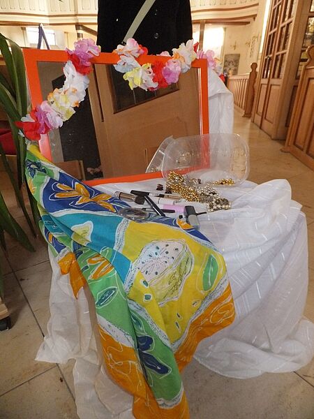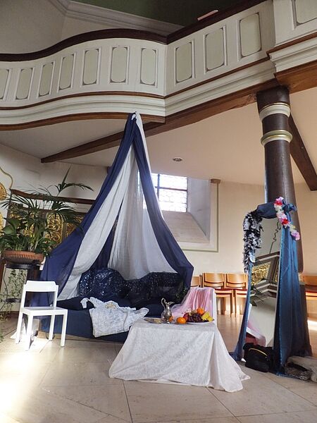 Die Geschichte wird als Theaterstück gespielt. Sie wird vorgelesen, die Mitspieler spontan ausgesucht, die Kinder-Akteure von der Erzieherin und der Pfarrerin dirigiert. Im Altarraum sind zwei Paläste aus Stühlen, Stäben und kostbaren Tüchern aufgebaut. Beim Männerpalast (rechtes Bild) steht der Thron. Für diese Geschichte ist die Verkleide-Truhe sehr wichtig. In ihr befinden sich: Königskrone, Königsmantel, Sicherheitsnadeln, Krone mit Edelsteinen, Prinzessinnen-Kleid, Briefrolle, Orden, Hüte und Mützen, Weste, Schmuckstücke, Spiegel, Lippenstifte, Parfüm u.s.w. Außerdem sind für den Schönheitswettbewerb verschiedene Stationen vorbereitet, an denen die Mädchen hergerichtet werden können.
