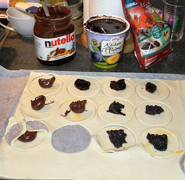 Für die Füllung: backfertige Mohnmischung oder Pflaumenmus oder Nutella (je nach Lust und Geschmack sind auch alle drei Varianten möglich)