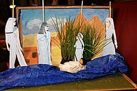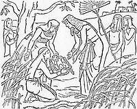 Dort, wo das Schilf ganz dicht ist, setzen wir vorsichtig das Körbchen mit Mose auf das Wasser. Ich verstecke mich im Schilf am Ufer. Von hier aus kann ich es gut sehen. Mama geht schnell weg. Mir wird es allmählich langweilig in meinem Versteck. Da höre ich Stimmen – oh weh, die Prinzessin, die Tochter des Pharao kommt mit ihren Dienerinnen.