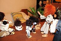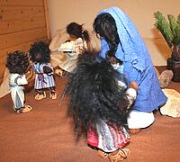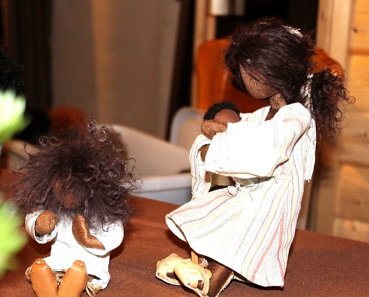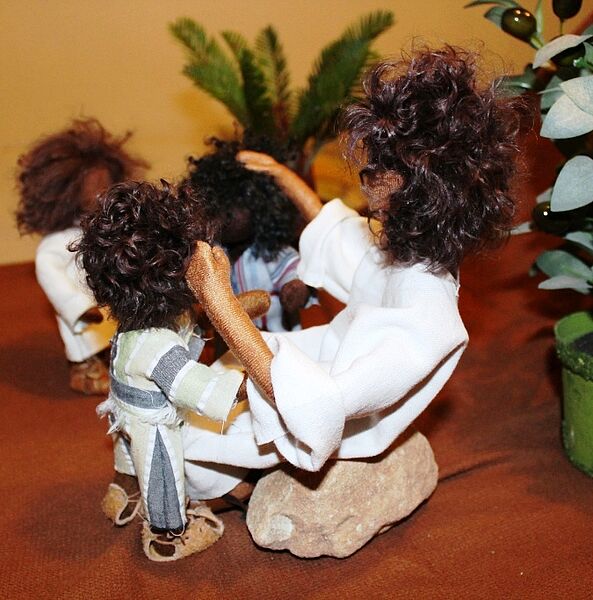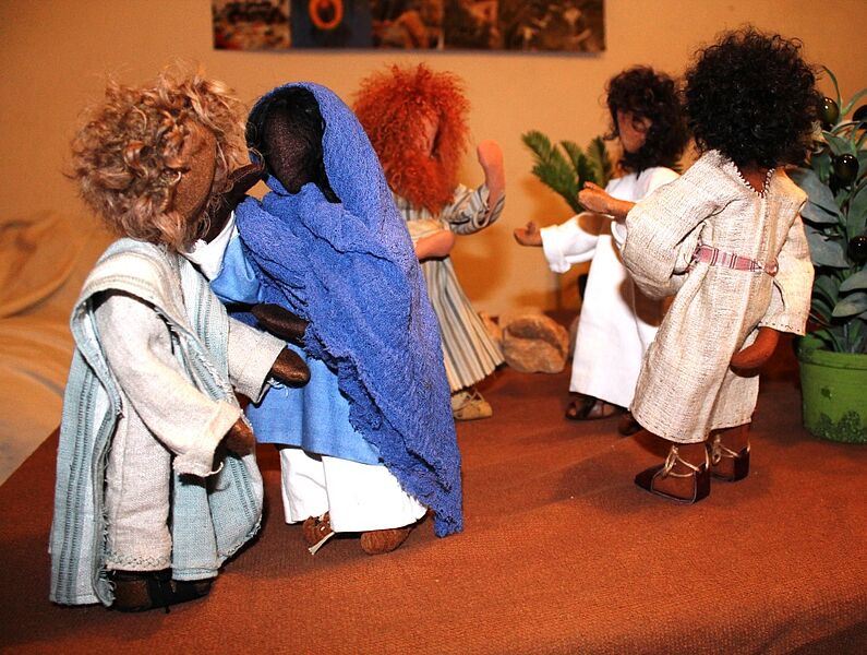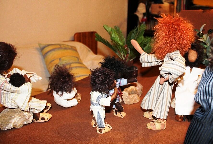 Wenn möglich, kann jedes Kind eine Figur (Kind oder erwachsene Frau) in die Nähe von Jesus stellen