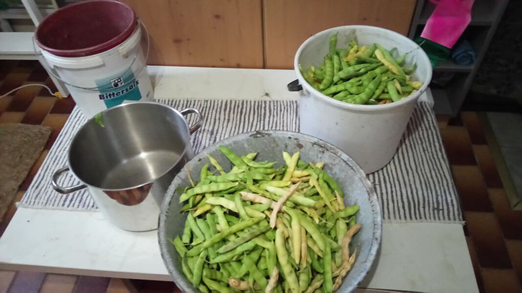 Um wachsen zu können, groß zu werden und fruchtbar zu sein, brauchen Bohnen einen guten Boden, „guten Grund“ sagt man bei uns. Im Herbst kommt Mist hinein, er muss feucht gehalten werden. Eine Stütze wird hineingesteckt. Das gibt der Pflanze Halt, bis sie über die Stange hinaus in den Himmel wächst.