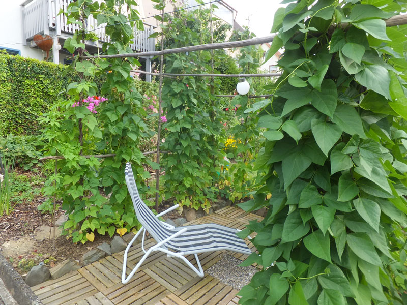 Ein Beispiel: Bohnen können im Sommer eine schattige Laube bilden, in der man sich ausruhen oder spielen kann. Schließlich wird es auch noch eine große Ernte geben. Grüne Bohnen, saure Bohnen, Bohnensalat, Bohnensuppe aus dem eigenen Garten ist etwas Besonderes.