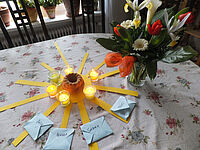 Sarah und Timo freuen sich. Heute ist Pfingsten, und das feiern sie immer besonders schön. Der Frühstückstisch ist geschmückt. In der Mitte liegen lange gelbe Papierstreifen von einer dicken Kerze ausgehend zu jedem Platz hin. Am Ende jedes Streifens liegt ein bunter kleiner Briefumschlag. Als alle am Tisch sitzen, sagt der Vater wie jedes Jahr: „Post ist gekommen, ein Brief von Petrus. Er schreibt uns, was ihm damals an Pfingsten passiert ist.“ Und dann liest der Vater aus einer richtigen Briefrolle die Geschichte vor. „Dürfen wir jetzt unser Geschenk aufmachen?“, fragt Sarah und hat ihren Briefumschlag schon in der Hand. „Ich glaube, Papa schenkt mir einen Lego-Nachmittag.“, sagt sie und schaut auf das Bild aus ihrem Umschlag. „Und mir will jemand eine ganze Woche beim Abwasch helfen.“, ruft der Papa. „Und mich lädt jemand zum Eis ein.“ Mama leckt sich schon die Lippen. Und was hat Timo? „Jemand will mir das Fahrrad putzen – auch nicht schlecht!“,meint Timo und greift nach einem Stück leckeren Bibelkuchen, den sie gestern mit den Eltern gebacken haben.