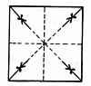 Ein buntes Papierquadrat wird zweimal zur Hälfte gefaltet, so dass Faltlinien in vier Quadraten entstehen. Dann noch einmal in Dreiecke falten, so dass die Faltlinien wie auf der Abbildung sichtbar werden. Von den Ecken her wird jeweils bis zur Hälfte eingeschnitten (siehe Markierung). Mit einer Stecknadel durch die vier Ecken stecken und sie dabei nach innen biegen und durch den Mittelpunkt feststecken. Dann die Nadel je nach Größe des Windrades durch einen Strohhalm oder einen weichen Stock stechen und mit einem Stück Korken oder Knete sichern.
