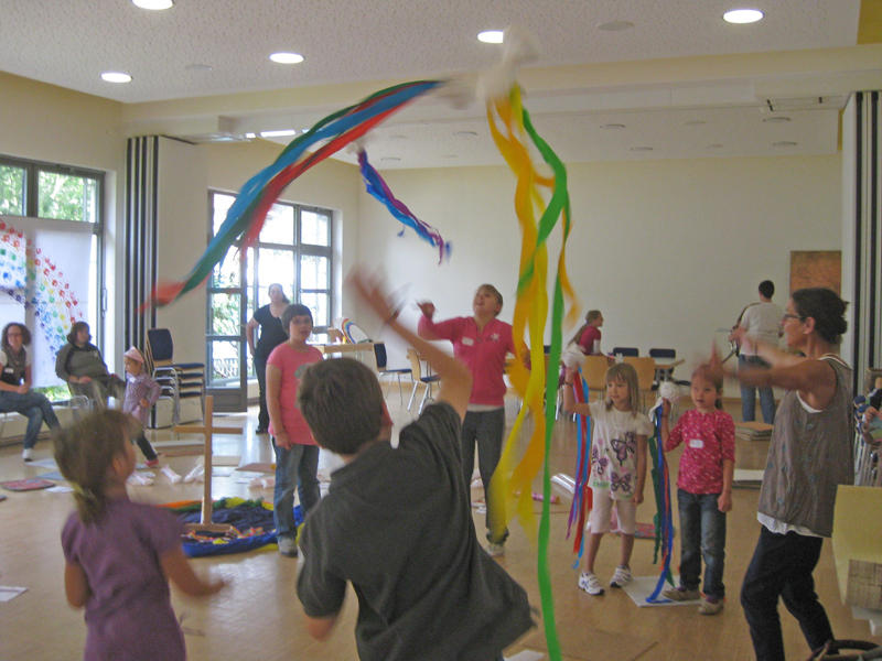 Ein schönes Spielzeug, das schnell gemacht ist, nichts kostet und viel Spaß macht, ist die Pfingstschleuder. Schneidet aus einem alten Stück Stoff ein Quadrat (30X30) aus. Von vielen kleinen Stoffresten wickelt ihr einen festen Ball. Einige bunten Krepppapier-Streifen, 120 cm lang, legt ihr nebeneinander, haltet sie in der Mitte zusammen, umwickelt dort den Stoffball fast eine Runde, so dass beide Enden der Fäden frei hängen. Nun packt ihr den Stoffball und die umgelegten Bänder in das Stoffquadrat und bindet es wie ein Säckchen fest zu. Die Bänder müssen frei heraus hängen. Der Ball fliegt wunderschön und lässt die bunten Bänder hinter sich her flattern. Wenn man das Ganze mit einer längeren Schnur zusammenbindet und diese in der Hand behält (am Ende eine kleine Schlaufe erleichtert das Festhalten), kann man die Pfingstschleuder nicht nur von sich weg, sondern auch um sich herum schleudern.