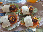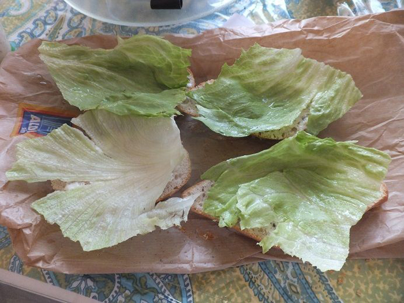Die bestrichenen Brötchenhälften mit einem zerpflückten Salatblatt belegen.