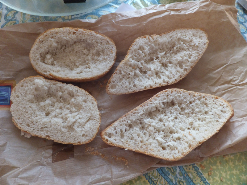 Brötchenhälften aushöhlen und das Innere essen! Dann die Hälften mit Hamburgercreme bestreichen.