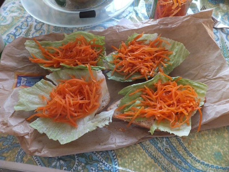 Geraspeltes Gemüse oder fertigen Möhrensalat auf das Salatblatt häufeln.