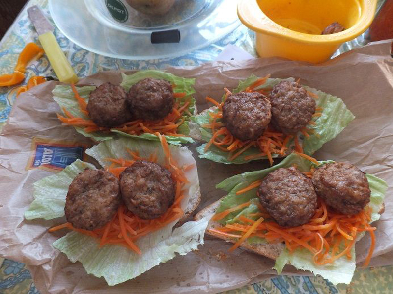 Zwei kleine Frikadellen darauf legen und ein Stück Käse als Decke. Mund und Nase aus Gemüsestücken oder Ketchup beziehungsweise Senf.
