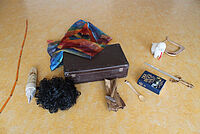 Koffer: Perücke, Schwert, Hanteln, dickes Buch, z.B. Lexikon, Kochlöffel, Schaf, Harfe, Ölfläschchen, Umhang für Samuel