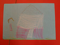 R., 6 Jahre malt ein Haus und erklärt: "Die Welt ist hell, wenn man ein schönes Zuhause hat, wo Mama und Papa und mein Bruder mich liebhaben."