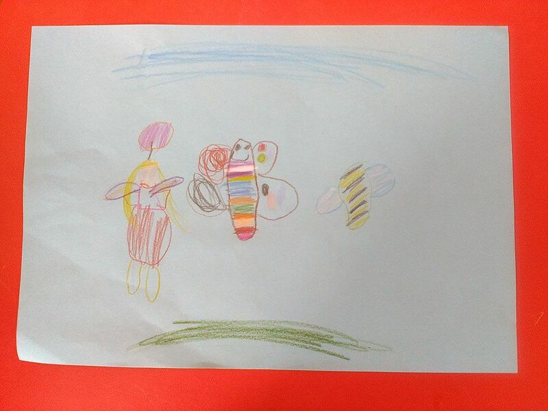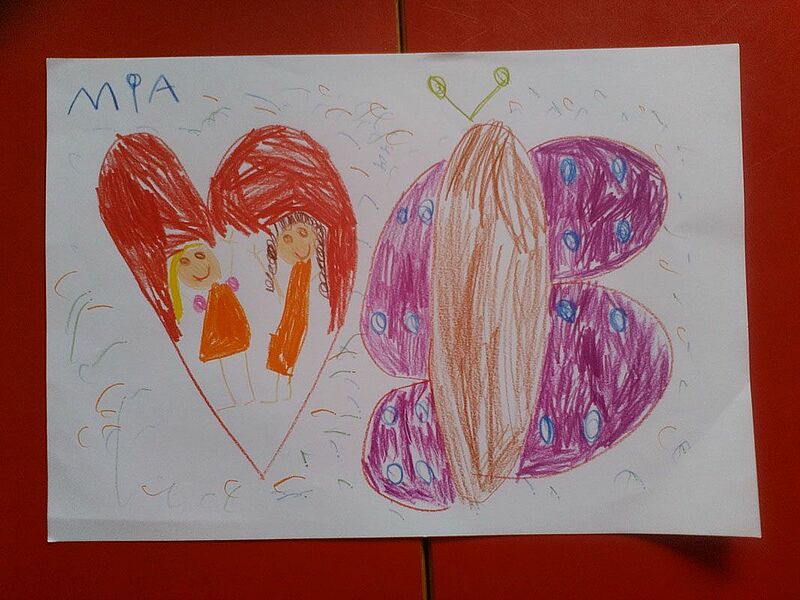 M., 6 Jahre malt natürlich auch ein rotes Herz mit sich und M. Sie sind auf einer grünen Wiese und ein großer Schmetterling fliegt vorbei.