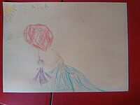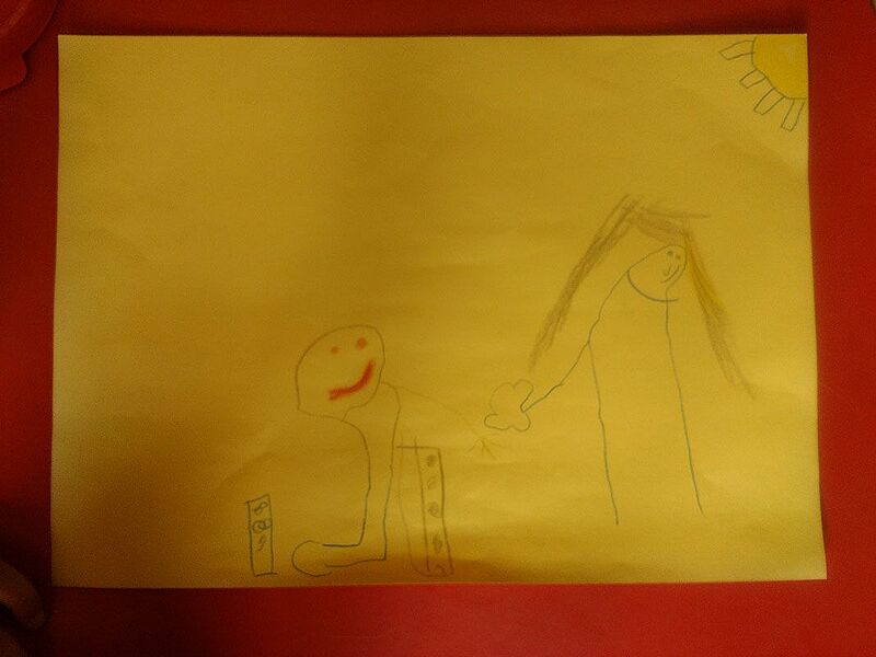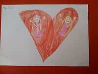 M., 6 Jahre malt ein großes Herz mit zwei Mädchen, die in die Luft springen. "Das sind M. und ich, wir sind beste Freundinnen und freuen uns."
