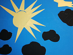 In der Mitte liegt ein aus Tonpapier ausgeschnittenes Sonnenrund. Am Rand der blauen Untergrundfläche ausgeschnittene Sonnenstrahlen und dunkle Wolken in verschiedener Größe. Alle werden eingeladen, Gott zu sagen, was ihnen auf dem Herzen liegt oder im Kopf herum geht. Niemand wird gezwungen! Ich kann einen Sonnenstrahl nehmen, ihn an das Sonnenrund legen und Gott laut oder leise sagen: „Ich freue mich darüber, dass …“ Oder ich nehme eine dunkle Wolke, lege sie auf das Himmelsblau und sage: „Ich habe Angst, dass …“ oder „Ich bin so sauer/traurig, weil …“. Zwischendrin kann immer wieder die kleine Liedstrophe gesungen werden.