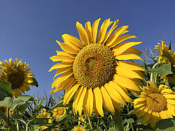 Die Sonnenblume gehört zu denjenigen Pflanzen, die ihren Blütenstand nach dem Stand der Sonne ausrichten können. Verantwortlich dafür ist ein spezieller Stoff, der die Pflanze auf der beschatteten Seite stärker wachsen lässt, so dass der Stängel sich gegen die Sonne hin wendet. Im Garten und auf dem Acker werden Sonnenblumen zwei bis drei Meter hoch. Manche Gartenbesitzer ziehen mit der richtigen Sorte, viel Dünger und einem Stützgerüst sogar über sieben Meter hohe Exemplare.