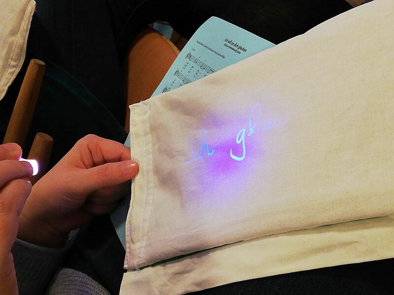 Das Wasserzeichen in einem Blatt Papier kannst du nur sehen, wenn du es gegen das Licht hältst. Oder wenn du mit unsichtbarer Tinte auf ein Blatt Papier schreibst oder malst – was du geschrieben oder gemalt hast, das wird erst dann sichtbar, wenn du es mit dem passenden Licht beleuchtest.