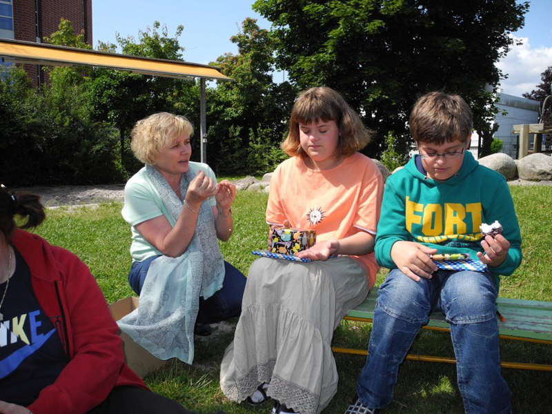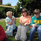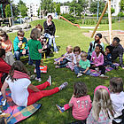 Als alle satt waren setzten wir uns im Kreis zusammen auf die Wiese und es begann die „Abschiedszeremonie“. Die Großen wurden mit einem Quiz und einem Bilderrätsel scherzhaft „geprüft“. (Bei falschen Antworten müssten sie nach den Sommerferien nochmal bei uns vorbeischauen und nachsitzen - was natürlich noch nie passiert ist!). Zur Belohnung gab es dann ein individuell ausgesuchtes Abschiedsgeschenk mit herzlichen Worten.