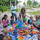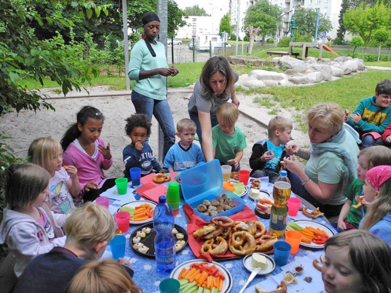 Das Wetter war gut, so dass wir auf dem Kindergartenspielplatz (nahe unserer Kirche) ein großes Picknick veranstalten konnten. Mit großem Eifer wurden Obst und Gemüse geschnippelt, Muffins gebacken und der Picknickplatz geschmückt. Die Freude auf diesen besonderen Dankgottesdienst mit den Kindern war greifbar und alle waren gespannt.