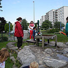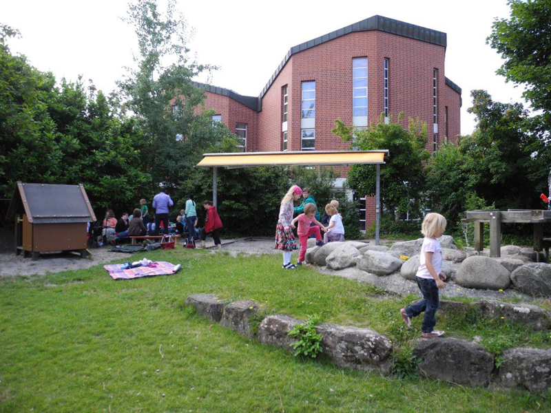 Zu Beginn wurde gemeinsam mit den Kindern und deren Eltern unser Begrüßungslied „Einfach spitze“ in der Kirche gesungen. Es gibt bei uns viele kleine Kinder, deren Mama oder Papa noch dabei sind. Es hat sich eingespielt, dass wir zusammen im großen Kreis Kindergottesdienst feiern. Nach dem Begrüßungslied ging es los, auf den vorbereiteten Spielplatz.