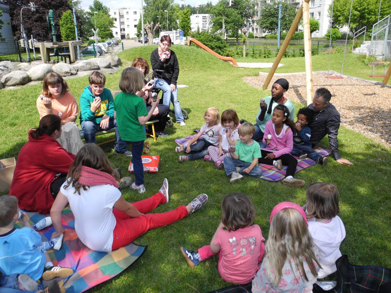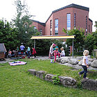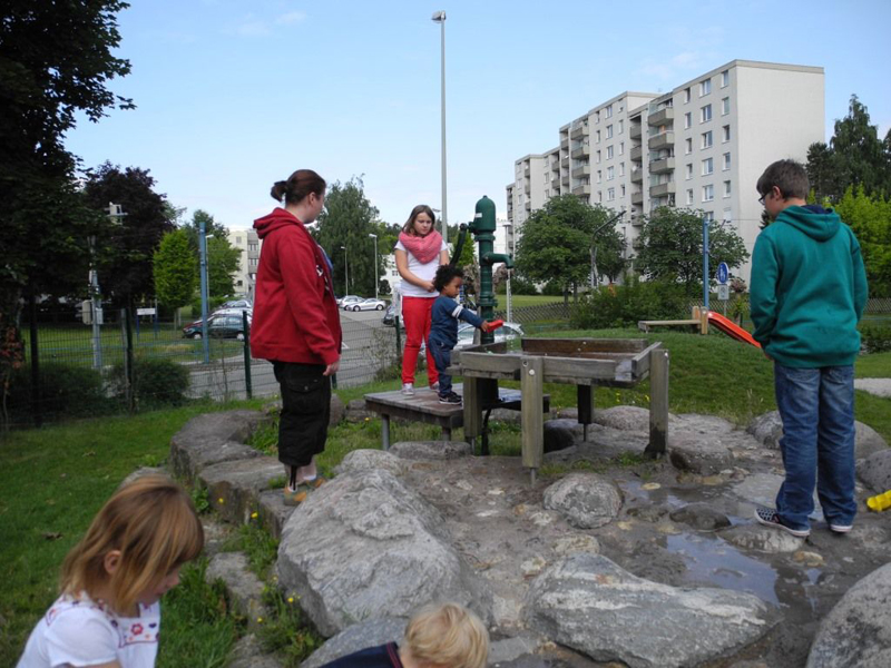 Es war schön zu sehen, wie Schaukel, Wasserpumpe mit Staudamm und Wippe gleich von allen in Beschlag genommen wurden. Die Kinder waren ausgelassen und tollten mit Eltern und Mitarbeiterinnen gemeinsam herum.