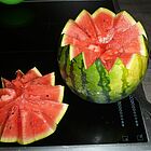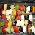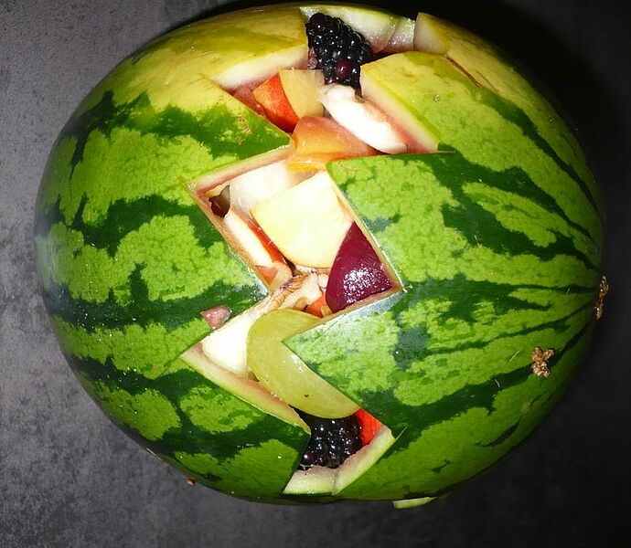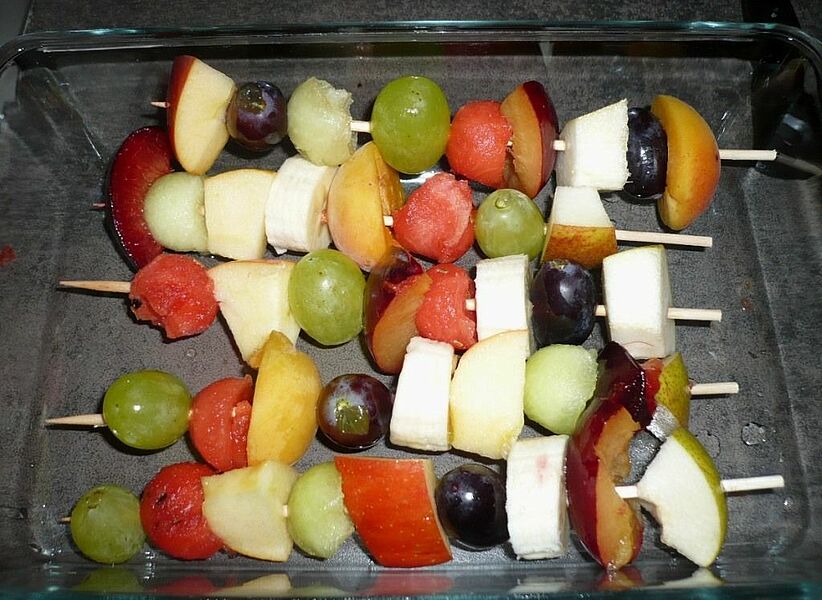 Die Obststücke passen sicher nicht alle in die Wassermelone. Man kann diese in bunter Reihenfolge auf Schaschlik Stäbe aus Holz aufspießen. So kann sich jeder einen eigenen Spieß nehmen und aufessen.