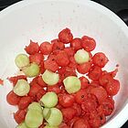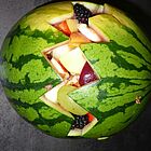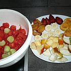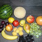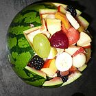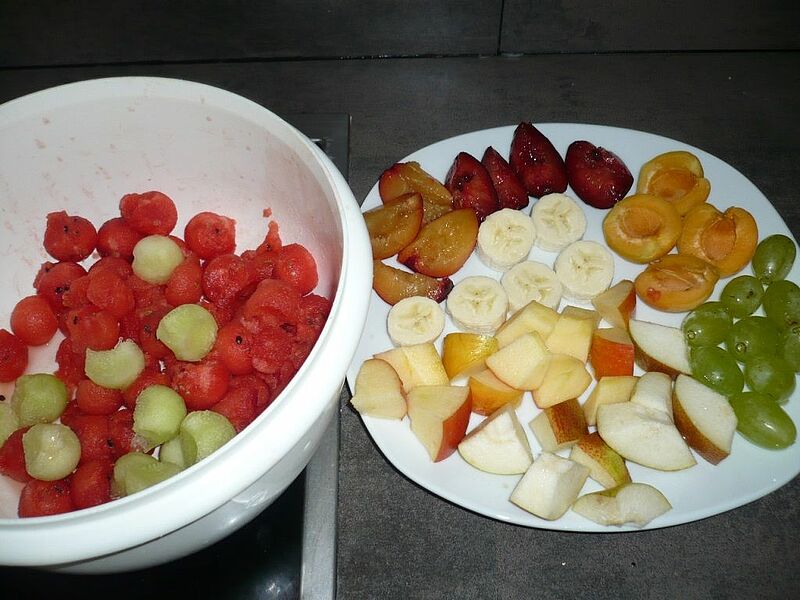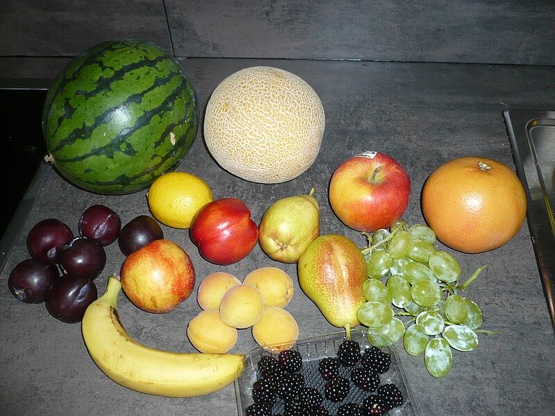 Zutaten: Eine Wassermelone, eine Galiamelone, einen Apfel, eine Birne, Trauben, Pflaumen, Brombeeren, Aprikosen, eine Banane, eine Nektarine und Saft von einer Zitrone.