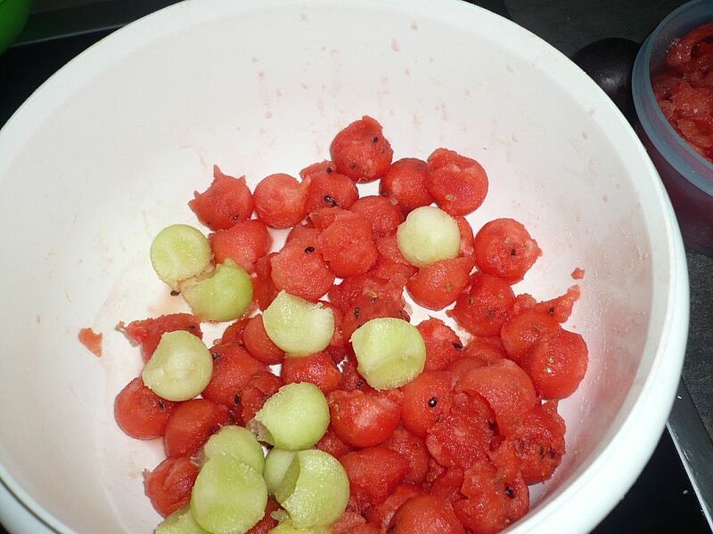 Das kann man gut mit einem Kugelausstecher machen – dann kann man aus den Melonen schöne Kügelchen formen. Das andere Obst wird in kleine Stücke geschnitten.