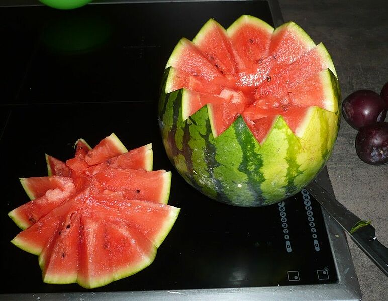 Zuerst schneidet man von der Wassermelone einen Deckel im oberen Viertel ab. Dann höhlt man sie aus.