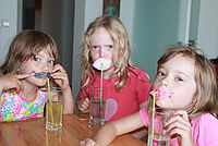 Wenn du jetzt mit dem Strohhalm ein Getränk trinkst, siehst du verändert aus. Schau dich mal mit dem Strohhalm im Mund in einem Spiegel an.