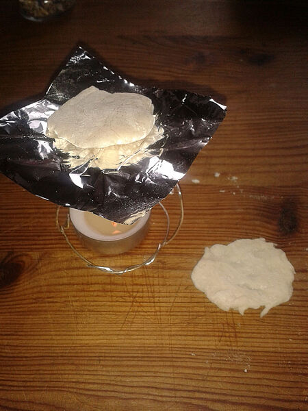 Teelicht anzünden, rundes Teigstückchen auflegen und von jeder Seite etwa drei Minuten backen (die Folie über der Flamme etwas bewegen, damit nichts anbrennt)