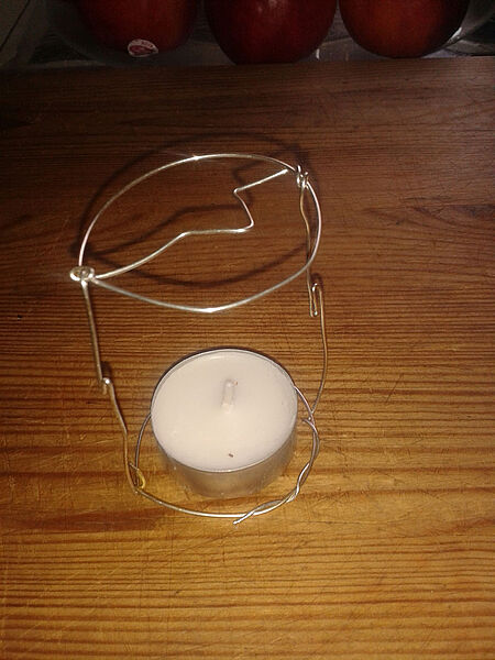 Schnapsglas, ein Stück Alufolie, selbst gebauter Teelicht-Backofen aus Teelicht und Draht (siehe Zeichnung).
