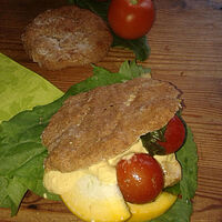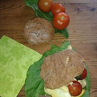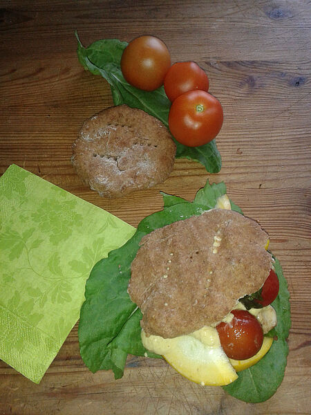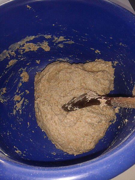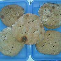 Schalte den Backofen auf 250 Grad ein. Verrühre Weizen- oder Dinkelschrot, Wasser, Öl und Salz miteinander und knete alles gut durch, bis der Teig ganz glatt ist. Forme sechs bis acht tennisballgroße Klöße, lege sie auf ein eingeöltes Backblech und drücke sie flach. Backe die Fladen im Backofen 10 bis 15 Minuten auf der oberen Schiene, bis sie schön braun geworden sind.