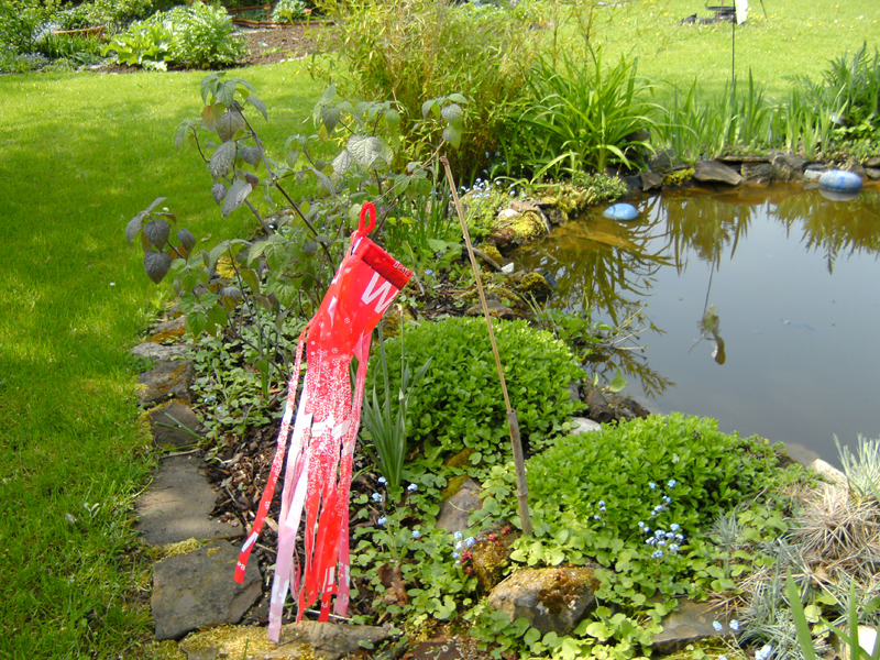 Die beiden Fäden bindest du in der Mitte mit einem weiteren Faden zusammen, den du dann an deinem Stab festmachst. So kann dein Windspiel schön flattern.