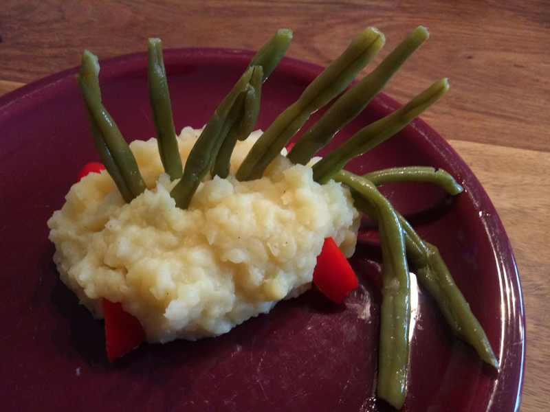Dann kannst Du Dir aus Kartoffelbrei einen schlafenden Drachenkörper basteln. Lediglich die grünen Bohnen-Rücken-Schuppen sind aufgerichtet, der Kopf ist versteckt. Nur die roten Paprikakrallen rechts und links des Körpers sind zu sehen.