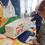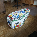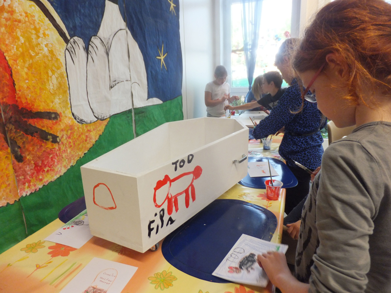In der Anlaufzeit des dritten Treffens wurde das Bilderbuch „Gehört das so?“ von Peter Schössov (Hanser) vorzulesen. Dann haben wir uns die Bilder der Kinder angeschaut und beraten, wer was wohin auf den Sarg malt. Die Kinder gingen mit Begeisterung ans Werk. Mit großer Anstrengung wurde geplant und besprochen, was auf dem Sarg abgebildet sein sollte. Im Abschlussritual zündeten wir Kerzen an für die, um die wir trauern. Das Lied „Die im Dunkeln stehn“ (aus: Dirk Schliephake, Das Liederheft Kirche mit Kindern 2, Hildesheim) diente als Verstärkung der Erinnerungen und Gliederung des Rituals. Die Kinder benannten viele verschiedene Trauerfälle.