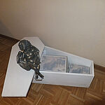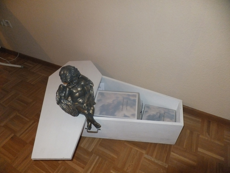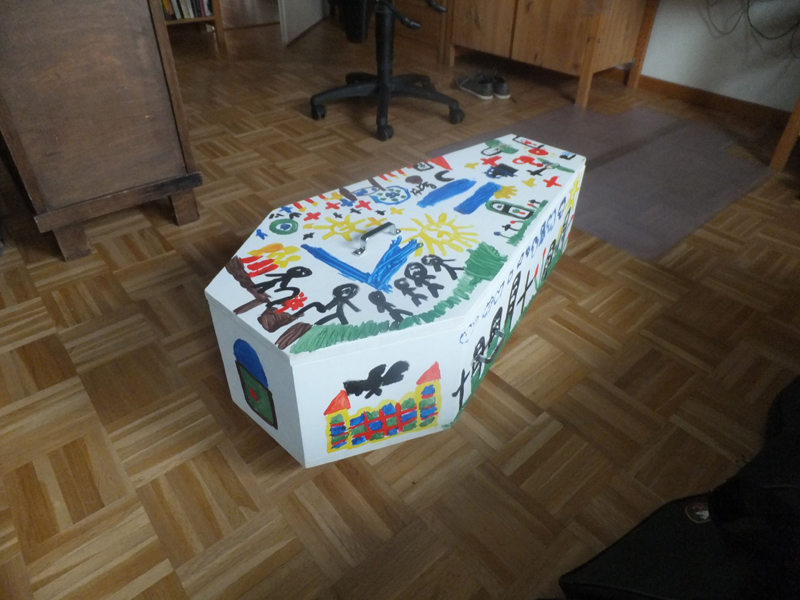 Der Schreiner baute uns für unser Projekt eine Kiste in Sargform (80x40x25), aus Sperrholz in weiß grundiert, Deckel abnehmbar, mit Griffen an den Seiten und am Deckel und vier Rollen am Boden montiert.