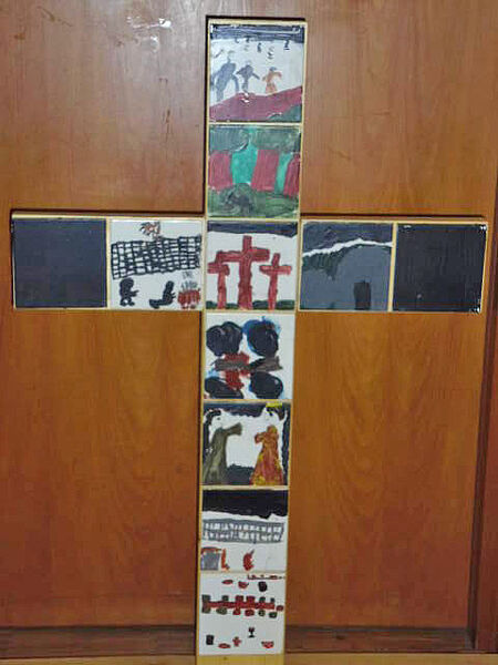 Der Vater eines Kindergottesdienstkindes baute ein großes Kreuz, auf das die Fliesen mit den dunklen Farben auf der einen Seite und die mit der hellen Farbe auf der anderen Seite aufgeklebt wurden.